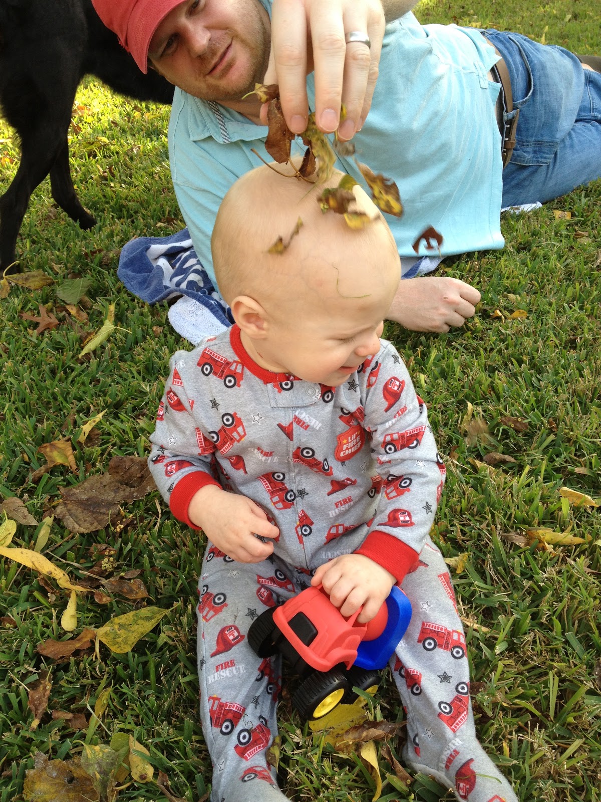 I'd write more, but - honestly - we didn't do very much. At least nothing of interest. We slept in, played outside in the warm Saturday sunshine FOR HOURS, took long afternoon naps on the couch, watched football, tried on winter hats to see which ones still fit Banner's bald noggin (after the cold front blew through Sunday morning), did a little shopping/baby proofing, got the down comforter out of the attic and went out to eat with family.