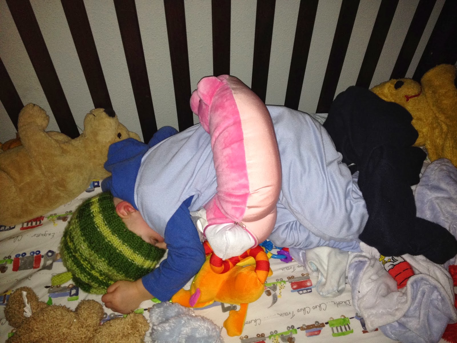 He is napping with my pink piggy neck pillow around his waist and his beanie on his head surrounded by a sea of blankets and toys. Because, obviously. |